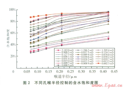 1)須家河組低滲透砂巖儲層孔喉細小,微孔喉發育,小于0.1μm的微孔喉控制的孔隙體積比在30%以上;微孔喉毛細管阻力大,氣相難以進入其控制的孔隙內,導致儲層高原始含水飽和度。