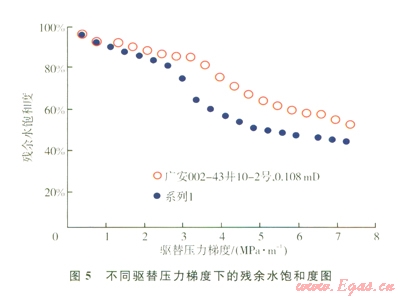對須家河組2塊低滲透巖樣進行了不同壓力梯度下氣驅飽和水巖樣實驗,在初始高含水飽和度階段,隨著驅替壓力梯度的增大,殘余水飽和度降低緩慢,主要是由于氣相飽和度小于20%,不能產生連續氣相運移。隨著驅替壓力梯度的進一步增大,氣相飽和度逐步增加,達到臨界含氣飽和度20%后,形成連續運移,這時氣相運移進入大喉道及其控制的孔隙中,使得含水飽和度快速降低。當含水飽和度降低到50%后,氣相進入更細小的喉道及孔隙的難度加大,驅替壓力梯度的增加導致含水飽和度緩慢降低(圖5)。須家河組低滲透砂巖氣藏儲層含水飽和度在40%~60%之間,高于束縛水飽和度,存在0~20%的可動水飽和度。驅替壓力梯度越大,水相越容易動用。