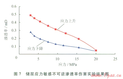 2)中等速敏和壓力敏感損害:儲層巖心液測速敏實驗表明,在1~5mL/min的測定流量范圍內,巖心的最小滲透率Kmin和最大滲透率Kmax分別為0.1029mD、0.2514mD和0.08mD、0.155mD,臨界流量為2~2.5mL/min,Kmin/Kmax分別為0.41、0.52,液測速敏損害較強(圖6)。儲層巖心應力敏感實驗結果由實驗結果可知:該地區低滲透儲層的應力敏感性為中等損害,滲透率由0.49mD降低為應力變化后的0.275mD,其應力敏感引起的不可逆滲透率損害率為43.9%(圖7)。
