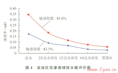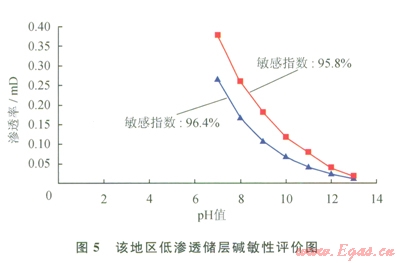 1)儲層巖心具有較強的水鎖、水敏和堿敏損害特征:根據對該地區低滲透儲層段含水飽和度的統計,其儲層段含水飽和度平均為64.81%,對照實驗結果,儲層段受到中等偏強水鎖損害(表1)。儲層段巖心水敏性實驗表明,滲透率分別由0.3485mD降至0.0572mD、由0.1750mD降至0.0292mD,巖心的敏感指數分別為83.6%和83.3%,說明該地區低滲透儲層段具有強水敏性(圖4)。儲層段巖心堿敏評價實驗結果表明,當pH值由7升至l3時,巖心滲透率分別南0.3762mD降至0.0158mD、由0.2639mD降至0.0095mD,巖心的堿敏感指數分別為95.8%和96.4%,該地區低滲透儲層具有強的堿敏性(圖5)。