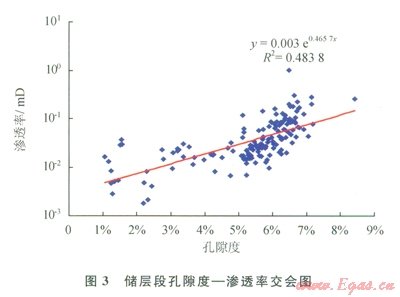 通過對該地區儲層段巖樣統計分析表明,儲層孔隙度主要集中分布在6%~8%(圖1),平均孔隙度為6.72%;儲層段樣品滲透率主要集中在0.035~0.5mD,占98.06%(圖2),平均滲透率為0.1085mD。儲層孔隙度和滲透率二者存在較好的指數相關性,R達到0.6988,滲透率隨孔隙度增大而增大(圖3)。因此,該區儲層屬于低孔、低滲透性儲層。
