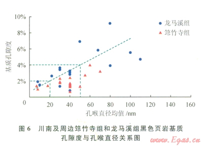 筇竹寺組頁巖樣品孔喉直徑均值一般介于7~105nm,樣品孔喉直徑分布頻率為低于20nm的樣品占9.1%,20~50nm的樣品占69.7%,50~80nm的樣品占12.1%,80~110nm的樣品占9.1%,即直徑小于50nm的中小孔隙占78.8%,直徑大于50nm的大孔隙僅占21.2%。龍馬溪組頁巖孔喉直徑均值一般介于8~160nm,樣品孔喉直徑分布頻率為低于20nm的樣品占5.1%,20~50nm的樣品占51.3%,50~80nm的樣品占l7.9%,80~110nm的樣品占20.5%,大于ll0nm的樣品占5.1%,即直徑小于50nm的中小孔隙占56.4%,直徑大于50nm的大孔隙占43.6%(為筇竹寺組的2倍)。兩套海相頁巖基質孔隙度與孔喉直徑均值都具有較好的正相關性(圖6),孔喉直徑均值為50nm以上、20~50nm和20nm以下的樣品分別具有2.7%~6.9%(平均為4.9%)、0.7%~3.6%(平均為2.1%)和1.0%~l.9%(平均為1.4%)的基質孔隙度。這表明,要形成孔隙度在2%以上的有效頁巖儲層,孔喉直徑均值一般需要超過20nm;要形成孔隙度超過4%的優質頁巖儲層,孔喉直徑均值需達到50nm以上。可見,在頁巖納米級孔隙系統中,對基質孔隙度貢獻最突出的是孔徑超過50nm的大孔隙,其次是孔徑介于20~50nm的中孔,而貢獻最小的是孔徑低于20nm的微小孔(對應的孔隙度一般低于2%);筇竹寺組頁巖以孔徑低于50nm的中小型孔隙為主,而孔徑超過50nm的大孔隙明最少于龍馬溪組,這是導致該頁巖基質孔隙度明顯減少并低于龍馬溪組的重要原因之一。