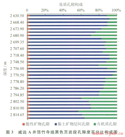 筇竹寺組黑色頁巖基質孔隙度為l.4%~3.1%(圖2),約為龍馬溪組富有機質頁巖段的1/3~1/2。在基質孔隙中,有機質孔隙占1.7%~43.2%(平均為18.6%),黏土礦物層間孔隙占53.9%~97.4%(平均為79%),脆性礦物孔隙占0.8%~3.1%(平均為2.4%)(圖3)。在2794~2819m富有機質頁巖段,巖性以黑色硅質頁巖為主,微含鈣質,TOC、黏土礦物和脆性礦物3者含量分別為2.4%~3.6%、l4%~27%、72.8%~85.7%,計算的總孔隙度為l.4%~2.0%,其中有機質孔隙占20%~43%(平均為34%),黏土礦物層間孔隙占53.9%~77.8%,脆性礦物孔隙僅占l.9%~3.1%(圖3)。