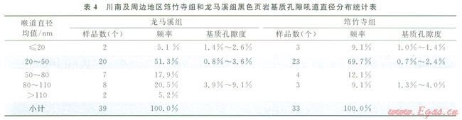 高壓壓汞法是近幾年發展起來的針對致密性儲層微觀孔隙結構定量表征的有效測試技術,可以測得直徑在幾個納米以上的頁巖孔喉大小和基質孔隙度[31]。筆者應用該壓汞法(實驗中最高驅替壓力為200MPa,識別孔喉最小半徑為3.675nm)對川南及其周邊72個頁巖樣品(其中筇竹寺組33個、龍馬溪組39個)開展了孔徑和孔隙度測試,并建立了測試樣品孔徑大小與基質孔隙度的相關關系,結果如表4和圖6所示。