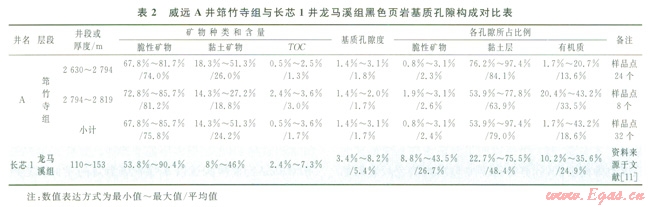 經過定量分析發現,筇竹寺組黑色頁巖儲集空間的主體為黏土礦物層間孔隙和有機質孔隙,與龍馬溪組相近,但兩套頁巖在基質孔隙體積和兩種主要物質產生孔隙體積的能力等方面則存在較大差異,主要表現為:筇竹寺組基質孔隙體積遠低于龍馬溪組,基質孔隙度為后者的l/3~l/2;前者單位質量黏土礦物產生的孔隙體積為后者的56%,單位質量有機質產生的孔隙體積為后者的50%。筆者通過對比分析認為,導致筇竹寺組頁巖基質孔隙度大量減少的原因可能緣于以下兩個方面。