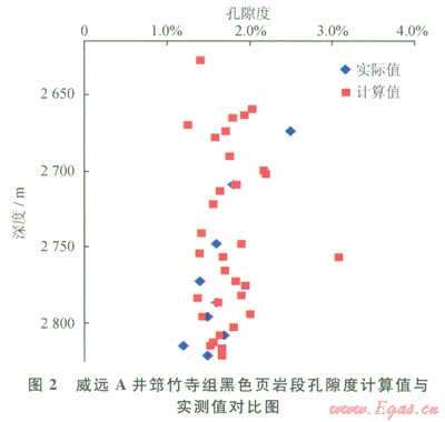 根據VBri、VClay、VTOC的計算結果,結合巖石礦物測試數據,筆者對威遠A井2630~2819m頁巖段的32個深度點(對應的TOC為0.5%~3.6%)進行了孔隙度測算,并將計算孔隙度與該深度段的實測孔隙度進行對比(圖2)。對比結果表明,上述32個深度點的計算孔隙度與該井段實測孔隙度吻合,從而證實所選擇的3個刻度點以及VBri、VClay、VTOC計算值符合筇竹寺組頁巖儲集空間的實際地質狀況,可以作為分析筇竹寺組孔隙構成的有效方法和地質依據。