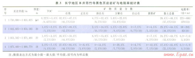 筆者依據長寧地區B井筇竹寺組黑色頁巖的巖礦、地化和測井響應資料,建立了中下部4段合計厚度159m頁巖的電阻率與TOC、黏土礦物的關系圖表(圖4、表3),以了解哪種物質是控制頁巖導電性的主要介質。此項研究的結果顯示,筇竹寺組黑色頁巖電阻率與黏土礦物含量無明顯相關性,但與TOC呈良好的負相關性,具體描述如下:①1730.88~1831.825m井段,厚度l01m,黏土礦物含量為28.4%~48.1%,TOC不足l%(平均0.42%),有機質總體較少,頁巖電阻率值一般為220~686W·m,顯然是黏土礦物的導電性在發揮主導作用,并且呈現高阻特征;②l831.825~1851.565m井段,厚度20m,黏土礦物含量保持穩定(29.2%~44.5%),而有機質含量開始增加,TOC一般介于1.0%~2.2%(平均為1.3%),頁巖電阻率則下降至18~202W·m(多為l0~100W·m),頁巖電性出現由高阻向低阻過渡特征,這表明有機質導電性開始顯現,其電阻率較黏土礦物低;③1851.565~1871.46m,厚度20m,黏土含量略有下降(一般為24.2%~43.7%),有機質含量增至l.9%~3.3%,頁巖電阻率則快速下降至0.9~7.6W·m,表現為明顯的低阻特征,這說明有機質具有較低電阻率,并且開始主導頁巖地層的導電性;④l871.46~1889.77m,厚度18m,黏土礦物含量下降至l8%~40%(平均為25.1%),有機質含量增加至2.2%~7.1%(平均為4.3%),頁巖電阻率則下降至0.1~1W·m,大大低于龍馬溪組頁巖和渤海灣地區低阻砂泥巖的電阻率,呈現超低電阻特征,這進一步證實筇竹寺組頁巖有機質具有較強的導電性(圖4、表3)。由此推測,川南筇竹寺組頁巖中的有機質可能出現了明顯的碳化現象,因而具有比黏土礦物更強的導電性,進而導致富有機質頁巖段(TOC>2%)具有低一超低電阻特征。