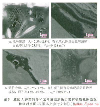 3)黑色頁巖段孔隙度較小的原因主要表現為兩方面:①該頁巖熱成熟度過高,有機質叮能出現碳化,導致有機質孔隙出現部分塌陷和充填;②該頁巖成巖作用強,導致大孔隙減少,巖石更加致密。