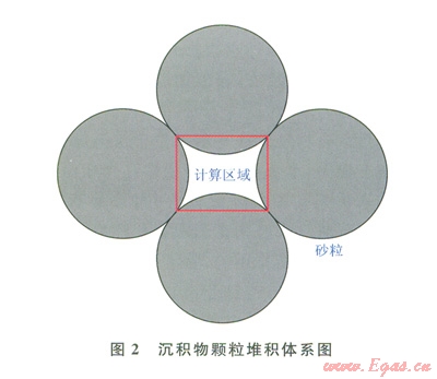 由于沉積物孔隙內水合物實際生成過程比較復雜,因而模型對物理過程進行了簡化,假定所有沉積物顆粒都為正網形且粒徑分布均一,沉積物體系內各向同性。自然界中,沉積物層位于海底,由于海水和沉積層的壓力,沉積物顆粒被壓實,孔隙水充填于沉積物孔隙內部,氣體溶解于填充的孔隙水中。沉積物顆粒間彼此錯落排列,形成沉積物間孔隙的是顆粒的圓弧面,計算區域的邊界為沉積物顆粒的弦長,如圖2所示。邊界條件采用反彈邊界。