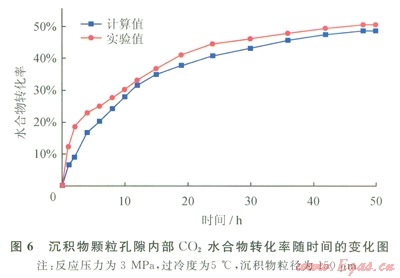 為了驗證模擬結果的可靠性,將模擬結果與實驗結果進行對比,如圖5、6所示。實驗得到的甲烷水合物和二氧化碳水合物的轉化率均大于模擬結果。這主要由以下幾個因素造成。
