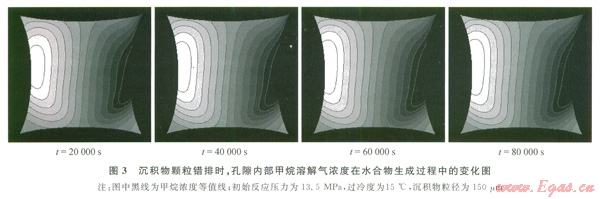 2)介觀尺度模型主要研究的是沉積物顆粒組成的孔隙,以孔隙水中溶解氣體的濃度為變量,模擬了由沉積物顆粒組成的單個孔隙內水合物的生成過程。結果表明,在沉積物顆粒體系內部,孔隙面相對比較平整,水合物先在沉積物壁面生成,而后沿著壁面法線方向增長,水合物在生成過程中呈層狀生成,最后在孔隙中間會合,從而充滿整個沉積物孔隙。
