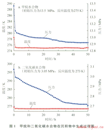 在進行數值模擬之前,對甲烷和二氧化碳氣體水合物的生成過程先進行了實驗室模擬,實驗模擬裝置主要由管路、氣瓶、增壓裝置、真空泵、恒溫水浴和反應釜組成,具體見本文參考文獻[12]。沉積物樣品選用南海淺表層沉積物,人工進行清洗并干燥,后進行篩分,按照一定的粒徑進行分類。本次實驗粒徑分布介于60~100目的沉積物,測得其孔隙度為36.7%。甲烷水合物和二氧化碳水合物生成過程分別在不同的溫度和壓力條件下進行,觀測水合物生成過程中體系內溫度和壓力的變化。實驗結果如圖1所示。