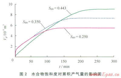水合物的飽和度(SHO)指儲(chǔ)層孔隙中水合物含量占沉積物孔隙總體積的比例,是表征水合物藏中水合物聚集程度的量度。在其他儲(chǔ)層特征相同的條件下,當(dāng)水合物飽和度較高,即系統(tǒng)中水合物含量越高時(shí),水合物分解會(huì)產(chǎn)生更多的氣體,但同相水合物的存在降低了儲(chǔ)層的流體疏導(dǎo)能力,影響壓力傳遞效果。如圖2所示[28],在初始階段,水合物飽和度越高時(shí),累積產(chǎn)氣量(Vp)反而較低,但到后期,隨著壓力的傳遞,水合物分解和累積產(chǎn)氣量都會(huì)提高。因此,從長(zhǎng)時(shí)間來(lái)說,高飽和度有利于提高產(chǎn)氣潛力。