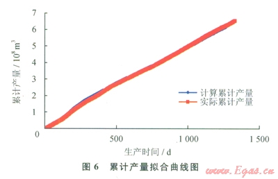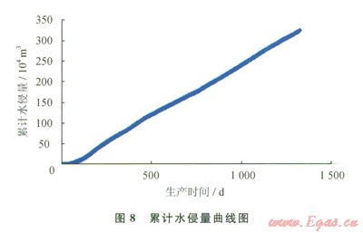 采用筆者提出的方法對該氣藏的動態儲量進行分析,首先將2口生產井等價為1口井,再利用實測地層壓力為約束條件,采用氣藏生產動態數據進行擬合,產量、壓力、累計產量擬合曲線如圖4~6所示,歷史擬合效果好。圖7為該氣藏的壓降關系曲線,由壓降關系式P/Z=-0.711Gp+21.661,可推出該氣藏的動態地質儲量為30.4×108m3。從圖8可以看出,目前累計水侵量達300×104m3,表明水體活躍程度高。