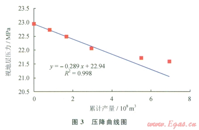 以南海東部PY30-1氣田某氣層為例,該氣藏為邊水氣藏,目前投產了2口井。通過實測數據點作出該氣藏的壓降曲線如圖3所示。