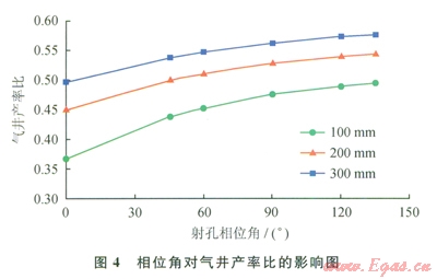 模擬研究認為孔密超過l6孔/m時,氣井產能增加幅度有限;相位角對產能的影響很明硅,作為酸壓(化)井,60°和l20°相位角比較合適,120°產能最高(圖4);產能隨孔眼深度的增加而增加,當孔深增加到一定程度時,氣井產能增加的幅度明顯變緩;氣井產能對孔徑十分敏感,產能隨孔徑增大增加明顯,在孔眼穿透污染帶以后這種影響更為顯著。