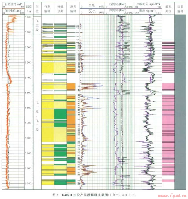 結合單井井身結構、同井質量等因素,具體優化氣井投產層段。如D402H井鉆遇氣層750m,含氣井段跨度l055.3m,固井質量優秀。考慮該井井段跨度大,飛三段氣層有鄰井控制,為降低投產作業難度和節約投資,對于氣層相對分散的飛三段氣層(厚度33m,跨度ll0m)不射孔(圖3)。通過投產層段優化,在不影響單井產能等開發指標的前提下,合理避射氣層,降低了投產作業費用。
