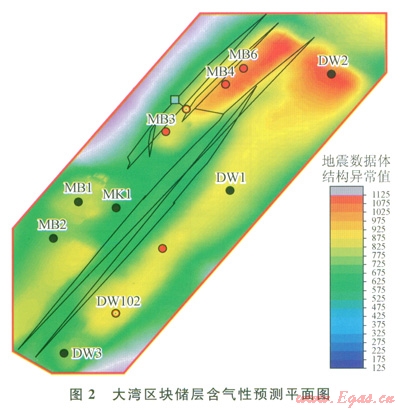研究認為,大灣區塊存在上下兩套地震數據體結構特征異常段,上含氣層為飛仙關組,下含氣層為長興組,主要呈北東一南西向分布。飛仙關組預測有利含氣面積49.0km2,長興組預測有利含氣面積l3.3km2,全區為62.3km2。其中DW2和MB4、MB6井區為l類有利含氣區,是培育高產井有利區域(圖2)。