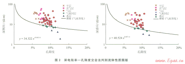 在生產實際應用中,為了簡便和跳過巖電參數的不確定性,常針對一定的巖性,結合試油資料,用Rt與j交會法判別流體性質。在Rt—j交會圖中分析典型氣層、水層、氣水同層測試成果,確定氣水分界線,并回歸出氣水分界線方程。落在氣水分界線上方的數據點為氣層或干層,落在氣水分界線下方的數據點為水層,在分界線附近的數據點為氣水同層。