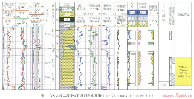 圖4為YX井須二段流體判別成果圖。儲層段2246.5~2266m飽和度比值小于1.3,反映不存在可動地層水;孔隙度反算的電阻率低于實測電阻率,具有含氣特征;側向—感應比值法判別為氣層,縱橫波速度比小于l.65為氣層。本段錄井顯示為氣侵,測井綜合解釋為氣層。儲層段2246.5~2266m(射孔段:2246.5~2250.5m、2257~2266m)測試獲氣ll.43×104m3/d。