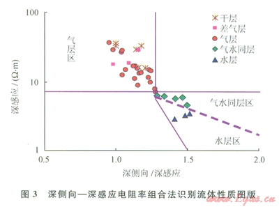 水層則表現為深感應電阻率明顯低于深側向電阻率數值的特征。其原因是由于淡水鉆井液濾液的侵入導致探測深度較淺的側向測井受高阻沖洗帶的影響更大。而水層由于含高礦化度地層水,其電阻率非常低,深感應測井主要反映原狀地層的低電阻率特征。因此,水層的第二個特征是深感應電阻率比較低,而且儲層的孔隙度愈高、其電阻率數值愈低。因此在測井資料質量可靠的前提下,根據試油成果,建立了深側向與深感應電阻率比值法氣水識別圖版(圖3),氣層深側向/深感應比值介于l~1.3,深感應測量值大于7W·m;水層深側向/深感應比值大于l.3,深感應測量值小于4W·m;其間為氣水同層過渡區。