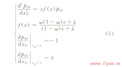 式中z為與滲流數(shù)學(xué)模型無因次時(shí)間相對(duì)應(yīng)的拉普拉斯空間自變量;`RDF為拉普拉斯空間中儲(chǔ)層裂縫系統(tǒng)無因次壓力;w為裂縫—孔隙雙重介質(zhì)儲(chǔ)層的儲(chǔ)容比,無因次;l為裂縫—孔隙雙重介質(zhì)儲(chǔ)層的竄流系數(shù),無因次;f(z)為綜合描述裂縫系統(tǒng)和孔隙系統(tǒng)儲(chǔ)滲級(jí)差關(guān)系的函數(shù)值,無因次;xD如為研究單向線性滲流問題的一維坐標(biāo)系中無因次坐標(biāo)值,設(shè)定氣水區(qū)交界處xD=0,水區(qū)外邊界處xD=l
