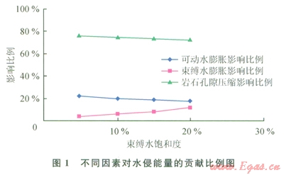 為了定量認(rèn)識(shí)前述3種岡素對(duì)水侵能量的影響程度,參照開展過相關(guān)研究的實(shí)際氣藏情況,計(jì)算預(yù)測(cè)不同束縛水飽和度條件下地層壓力從原始狀態(tài)的60MPa降到l0MPa后可動(dòng)水彈性膨脹、束縛水膨脹及儲(chǔ)層孔隙壓縮引起的體積變化在水區(qū)總體積變化巾所占比例(1)。結(jié)果顯示,地層壓力降低后儲(chǔ)層孔隙壓縮效應(yīng)對(duì)水侵能量的貢獻(xiàn)比例最高,因此依據(jù)式(3)可得到估算極限水侵量在可動(dòng)水體儲(chǔ)量中所占比例的近似公式。