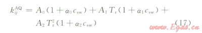 2)對混合規則作出改進,非水相和水相分別采用兩套不同的二元交互作用系數。非水相中的烴水交互作用系數采用擬合的固定值;水相中的烴—水交互作用系數(kijAQ)作為烴組分偏心因子(w)、對比溫度(Tr)和礦化度(csw)的函數,即
