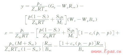 注意到x和y均為壓力的函數,不同壓力下的數據點在y—x坐標圖中應位于同一直線上,直線的斜率即原始烴類孔隙體積。計算過程中可采用試算法確定部分未知項。包含自由氣與水溶氣的總儲量為: