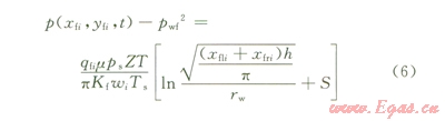 第i條裂縫就可以看成是一個以流動半徑為Ri,厚度為裂縫寬度wi,邊界壓力為裂縫尖端壓力p(xfi,yfi,t),滲透率為Kf,流壓pwf的微型氣藏,其流動方式可以看成徑向流,所以氣體在裂縫內的流動過程可表示為: