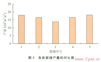 由圖3可以看出:水平氣井端部裂縫(1號和5號裂縫)的產量最高,中部裂縫(2號和4號裂縫)產量其次,中心裂縫(3號裂縫)產量最低。這是由于多裂縫之間干擾相互疊加影響的結果,水平氣井端部裂縫受到的干擾最小,而中心裂縫受到的干擾最大。與不考慮高速紊流(非達西流動)時的產量變化規律相似。