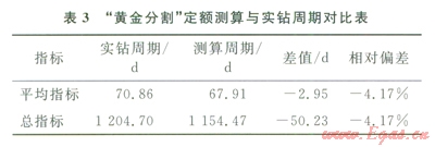 塔里木油田輪南區(qū)塊近4年共完鉆井18口,按照鉆井定額編制原則,選出17口與標(biāo)準(zhǔn)井井型類似的基礎(chǔ)井,編制該區(qū)塊鉆井周期定額。定額測(cè)算周期與實(shí)際鉆井周期對(duì)比結(jié)果見表3。可以看出,采用“黃金分割”測(cè)算出的平均單井鉆井周期比實(shí)際統(tǒng)計(jì)周期縮短2.95d,定額相對(duì)偏差為4.17%,滿足工程實(shí)踐需要。