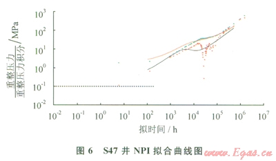 此外,S47井典型曲線分析也表明(圖4),該裂縫系統存在多個儲集體,不同連通范圍在NPI曲線上均有特征反映,且明顯可以發現由于地層水侵影響,造成NPI導數曲線異常下掉,與前面理論研究認識一致。