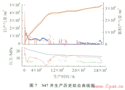 S47井裂縫系統儲層裂縫、溶洞發育,為典型裂縫一溶洞型氣藏。生產動態、地層水侵特征復雜,生產初期水產量大,油壓、產氣量遞減快;生產中期水產量降低,產氣量保持相對穩定,油壓快速上升,接近初期最高值;生產后期,產水量再次增大,油壓、產氣量快速下降,生產不連續,排水采氣工藝措施維持生產。此種異常生產特征表明,隨著生產進行,氣藏連通范圍在不斷增大,表現出存在多個儲集體、外部異常能量補充的現象。