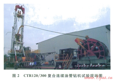 2010年,在四川宏華石油設備有限公司廣漢廠區,對CTRl20/300復合連續油管鉆機進行了鉆井試驗(圖2),試驗的目的:①初步掌握連續油管鉆井工藝;②驗證連續油管鉆機各部件是否滿足設計要求,為相關設備和零部件的改進提供依據;③考察采用連續油管鉆井是否能顯著提高鉆井速度;④考察乃Æ88.9mm連續油管在影Æ215.9mm井眼的鉆進過程中,連續油管是否能提供相應的鉆壓和承受鉆頭的反扭矩;⑤考察連續油管鉆井過程中井眼的清洗情況。