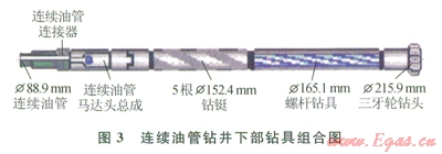 第二次開鉆進行連續油管鉆井試驗(圖3),Æ215.9mm鉆頭鉆達設計試驗井深350 m。主要鉆遇泥巖、頁巖和砂巖。鉆井參數:鉆壓為20~30kN,排量為18~20L/s,泵壓為3~5MPa。鉆井液參數:密度為1.05~1.15g/cm3,漏斗黏度為38~40s,API失水量為5mL,泥餅厚度為0.5mm。鉆具組合:Æ215.9mm鉆頭+Æ165.1mm螺桿鉆具+431×4A0接頭+5根Æl52.4mm鉆鋌+4A1×310接頭+Æ120.65mm馬達頭總成+Æ139.7mm連接器+Æ88.9mm連續油管。