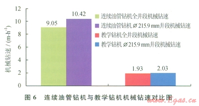 2)連續油管的Æ215.9mm井眼段鉆進,進尺為285.74m,純鉆時間為27.40h,機械鉆速為l0.42m/h。而采用宏華2號教學鉆機鉆的Æ215.9mm井眼段平均機械鉆速僅為2.03m/h。因此在Æ215.9mm井眼的鉆進中,連續油管鉆機的機械鉆速是教學鉆機機械鉆速的5.1倍(圖6)。