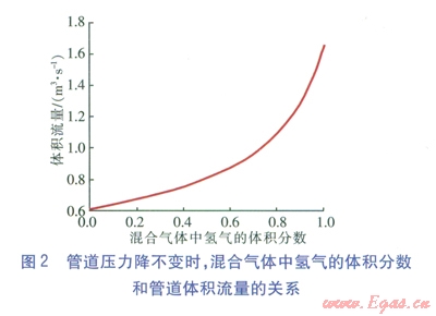 由圖2可知,氫氣加人到天然氣管道后,若保證壓力降不變,則隨著氫氣體積分?jǐn)?shù)的增大,和輸送天然氣相比,管道的體積流量急劇增大。