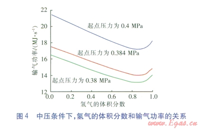 由圖4、5可知,增大管道的壓力降后,無論中壓還是低壓條件,管道的輸氣功率均有顯著提升。在中壓條件下,混合氣體中氫氣的體積分?jǐn)?shù)為0.23時(shí),為保證輸氣功率不變,則起點(diǎn)壓力需從0.38MPa增大到0.384MPa。在低壓條件下,混合氣體中氫氣的體積分?jǐn)?shù)為0.23時(shí),為保證輸氣功率不變,則起點(diǎn)壓力需從7kPa增大到7.3kPa。這說明微小提升壓力降,就能保證管道的輸氣能力不變。