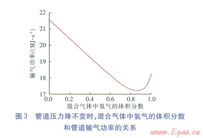 由圖3可知,氫氣加入到天然氣管道后,若保證壓力降不變,則無論氫氣的體積分?jǐn)?shù)為多大,和輸送天然氣相比,管道的輸氣功率均是下降的,即管道的輸氣能力是降低的。當(dāng)氫氣在混合氣體中的體積分?jǐn)?shù)大于0.83后,管道的輸氣功率有小幅回升,但和輸送天然氣相比,管道的輸氣能力仍然是下降的。在圖1中也有相類似的情況,當(dāng)氫氣在混合氣體中的體積分?jǐn)?shù)為0.83左右時(shí),混合氣體的華白數(shù)是最低的。