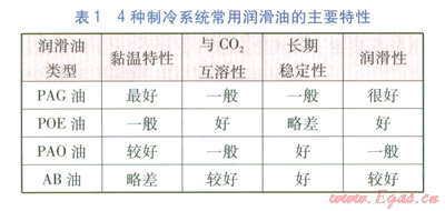 目前,制冷系統常用的潤滑油包括PAG油(聚亞烴基乙二醇油)、POE油(脂類油)、PAO油(聚α-聚烴油)、AB油(烷基苯類油)等[11],主要特性見表1。