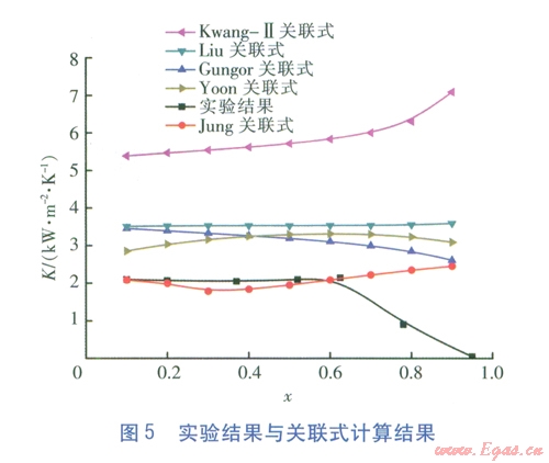 筆者選取5種經典換熱關聯式,將本次設定實驗條件(PAD油的質量分數固定為0.75%)作為已知計算條件,比較實驗結果與換熱關聯式計算結果,從中篩選出適于計算混合物水平光滑管內流動沸騰換熱系數的傳熱關聯式。