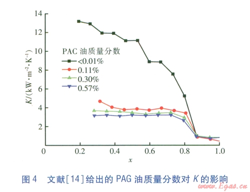 圖4與圖3類似,在低干度區,C02主要以液態形式存在,對PAG油的溶解度較大,表現為PAG油質量分數對K的影響很大。隨著工質干度的增大,尤其干涸發生以后,氣態C02的比例增大,氣態C02對PAG油的溶解性很差,大部分PAG油析出,PAG油質量分數不再是影響K的決定因素。最終,無油工況與含油工況的K趨于一致。