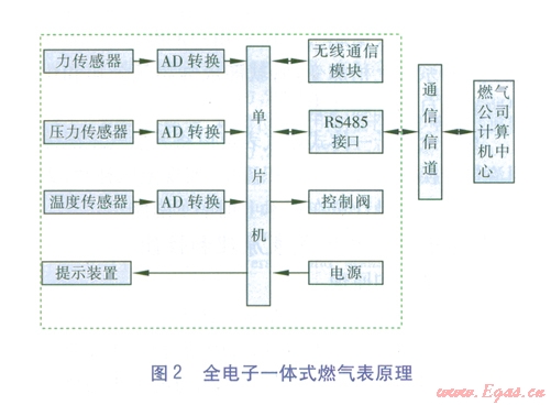 壓力傳感器、溫度傳感器、力傳感器的模擬信號經(jīng)AD轉(zhuǎn)換后傳給單片機,單片機加以處理后發(fā)送給提示裝置(液晶屏、發(fā)光管和蜂鳴器)以提示用戶,并可向控制閥發(fā)出指令以實現(xiàn)通斷功能。通過通信接口(RS485)將計量數(shù)據(jù)通過通信信道發(fā)送到燃氣公司的計算機中心,或通過無線通信模塊以無線傳輸?shù)姆绞桨l(fā)送到燃氣公司的計算機中心,并接受計算機中心發(fā)出的指令實現(xiàn)控制功能。全電子一體式燃氣表原理見圖2。