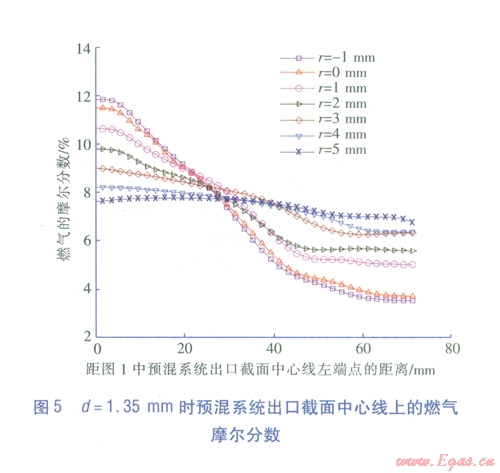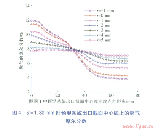 不同噴嘴直徑d 和噴嘴位置條件下,預(yù)混系統(tǒng)出口截面中心線上混合氣中燃?xì)獾哪柗謹(jǐn)?shù)見圖46可知,當(dāng)r=-1mmr=0mm時,中心線上燃?xì)饽柗謹(jǐn)?shù)的不一致性非常明顯,摩爾分?jǐn)?shù)波動范圍為4%12%R越大,中心線上的燃?xì)獾哪柗謹(jǐn)?shù)一致性越好。當(dāng)r=4mm5mm時,中心線上燃?xì)獾哪柗謹(jǐn)?shù)幾乎相同,這說明此條件下混合效果比較好。因此,為了實現(xiàn)燃?xì)夂涂諝獾耐耆A(yù)混,取r4mm