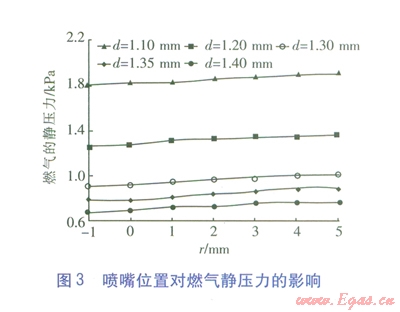 模擬的噴嘴位置對燃?xì)忪o壓力的影響見圖3。由圖3可知,噴嘴的直徑越小,燃?xì)馑枰撵o壓力越大。當(dāng)噴嘴的直徑d<1.30mm時,燃?xì)獾撵o壓力大于1.0kPa。因此噴嘴的直徑應(yīng)大于1.30mm,否則電磁閥后(燃?xì)鈬娮烨埃┤細(xì)獾馁|(zhì)量流量將不能滿足燃燒器熱負(fù)荷的要求。