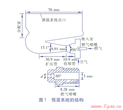 燃?xì)夂涂諝饣旌系男Ч麤Q定了燃燒效率和污染物的排放量。利用引射器實現(xiàn)燃?xì)夂涂諝馊A(yù)混,可以達(dá)到燃?xì)饪焖贌崴魅紵魅A(yù)混燃燒的目的。為了掌握預(yù)混系統(tǒng)幾何結(jié)構(gòu)參數(shù)對預(yù)混效果的影響,建立了燃?xì)夂涂諝忸A(yù)混系統(tǒng)數(shù)學(xué)模型,利用fluent軟件對燃?xì)夂涂諝忸A(yù)混系統(tǒng)進(jìn)行模擬。