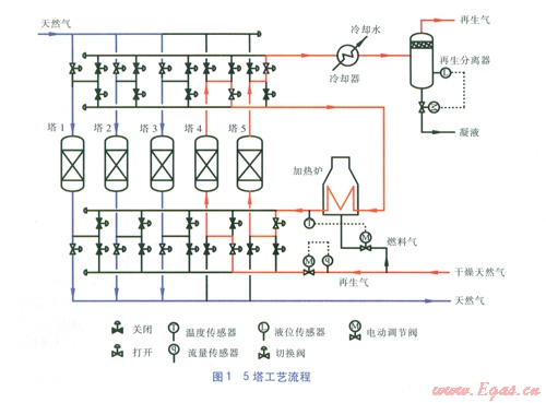 醇。塔5出口再生氣經(jīng)冷卻器冷卻至40℃左右后,進(jìn)入再生分離器分離出游離水和硫醇,最后進(jìn)入尾氣處理單元。下一切換周期為塔2、3、4吸附,塔5進(jìn)行冷卻,塔l進(jìn)行加熱再生,這樣依次進(jìn)行。
