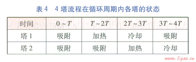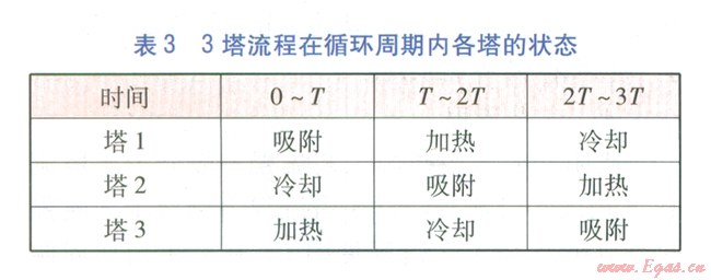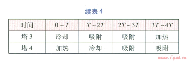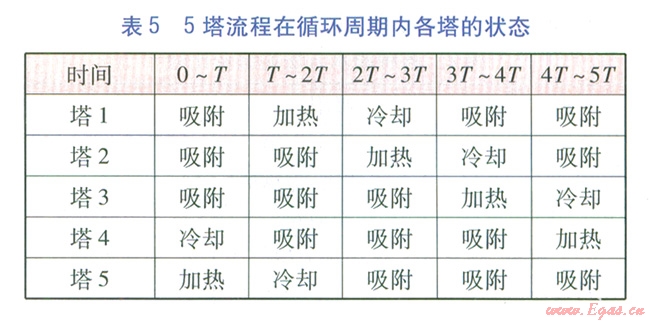 由5塔流程可知,再生氣先對(duì)已加熱再生分子篩塔進(jìn)行冷卻,然后經(jīng)加熱爐升溫后對(duì)已完成吸附的分子篩塔進(jìn)行加熱再生,這個(gè)過程是同時(shí)和連續(xù)的。當(dāng)對(duì)已加熱再生分子篩塔的冷卻完成后,才能進(jìn)行分子篩塔的切換,我們將分子篩塔的冷卻或加熱再牛時(shí)間稱為切換周期r。將每座塔均被加熱再生、冷卻一次的時(shí)間稱為循環(huán)周期,例如對(duì)于3塔、4塔、5塔流程,循環(huán)周期分別為3T、4T、5 T。3塔、4塔、5塔流程在循環(huán)周期內(nèi)各塔的狀態(tài)分別見表3~5。