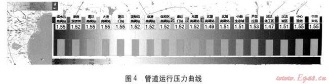 管道核心工藝圖的主要表現(xiàn)形式是按照廠站分布和管道走向,將廠站工藝和管道走向相結合。從該圖上,可以看到單條高壓管道的完整平面工藝,包括廠站內的工藝,同時可以看到整條管道運行壓力曲線(見圖4)、廠站工藝運行狀態(tài)顯示。